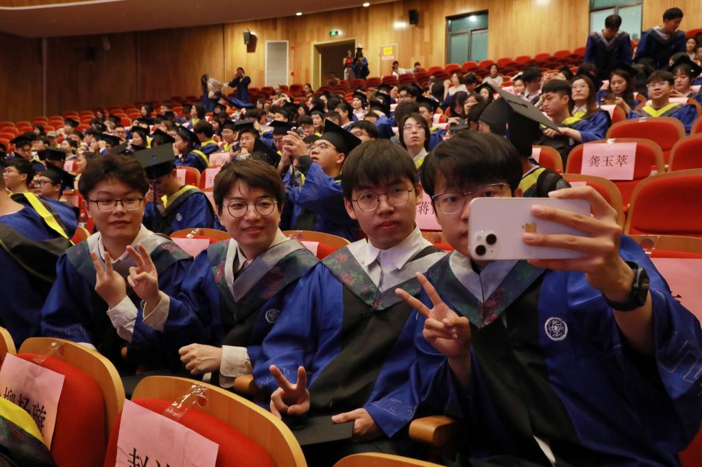 学位授予环节,校学位评定委员会委员一道为硕士学位获得者颁发学位证书、拨穗正冠。毕业生们与校长陈建孟合影留念。
