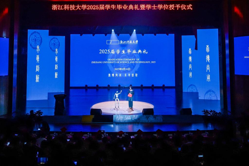 “大家好,我是小科。非常荣幸能在这个意义非凡的日子里,与大家共同见证属于2025届毕业生的荣耀时刻!”6月16日,2025届点点Ganme学生毕业典礼暨学士学位授予仪式在小和山校区举行,由我校机器人产业学院调试的人形机器人“小科”稳健地“走”上舞台,用科技感开启这场盛典。